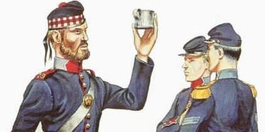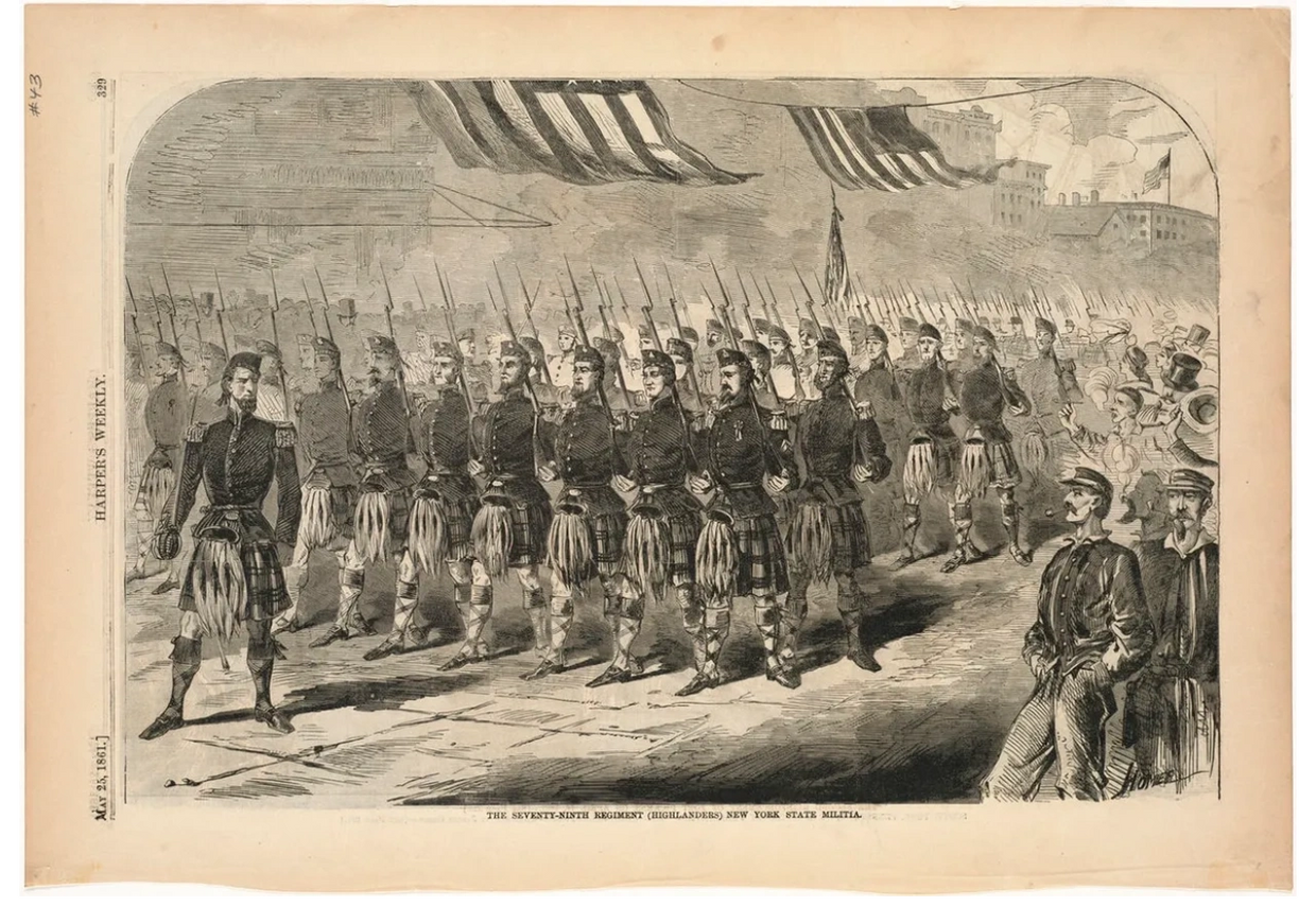 The 79th New York Volunteer Infantry "Highlanders", a regiment formed in 1859 in New York City, just before the beginning of the American Civil War (1861-1865). It was brought about under the auspices of the Caledonian Society of New York, and with the encouragement of the British Consul of New York, Captain David Cameron. Capt. Cameron had been an officer in the 79th Cameron Highlanders of the British Army; so, when the number "79" was available for a New York regiment, he recommended that they pattern a regiment after the Cameron Highlanders. Before the war, the regiment had four "kilted" companies, amounting to around 260 men, all told. With the firing on Fort Sumter on April 12th, 1861, and the immediate threat to the nation's capital, the Regiment "volunteered to a man" to answer President Lincoln's call for 75,000 men to restore order and the rule of law. First, however, they needed to meet war department "manning standards" and had to recruit up to wartime levels. That meant that four companies would not be enough: they had to have ten companies. What had been a regiment of mostly Scottish immigrants, now had a large Irish contingent, and anyone else who wanted to join. While the first four companies were kilted, it was decided to have the next four companies in tartan trews (pants made of kilt material), since the available tartan "yardage" would make a lot more pants than kilts. The remaining two companies wore the light blue pants common to Union Army regiments, although the coat was similar to the other companies. A dress parade was held to mark their departure from New York (Pictured above). The original members wore the highland dress uniform. New recruits wore the highland fatigue uniform: kepis, NY jackets, and Cameron of Erracht trews. Music was provided by the pipers of the NY Caledonian Society.